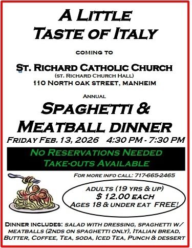 Saint Richard Parish is rooted in the heart of Manheim, a welcoming borough in Lancaster County founded in 1762. Our parish family is proud to be part of this community, sharing faith and fellowship for generations.